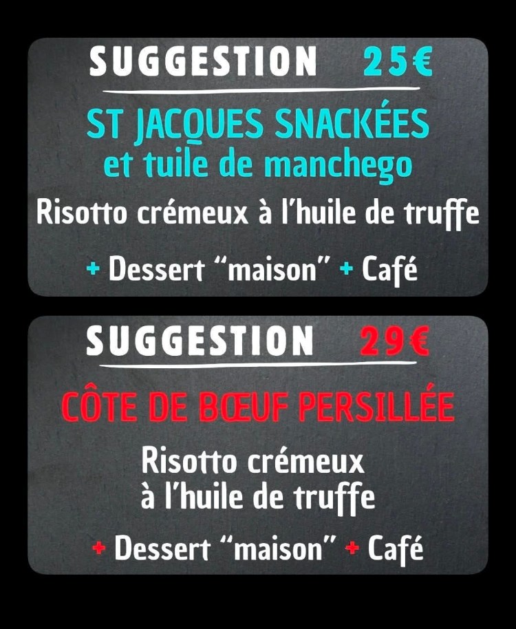 Notre chef élabore également une SUGGESTION éphémère à partir de produits de sélection (Souris d’agneau, pavé de thon, …)