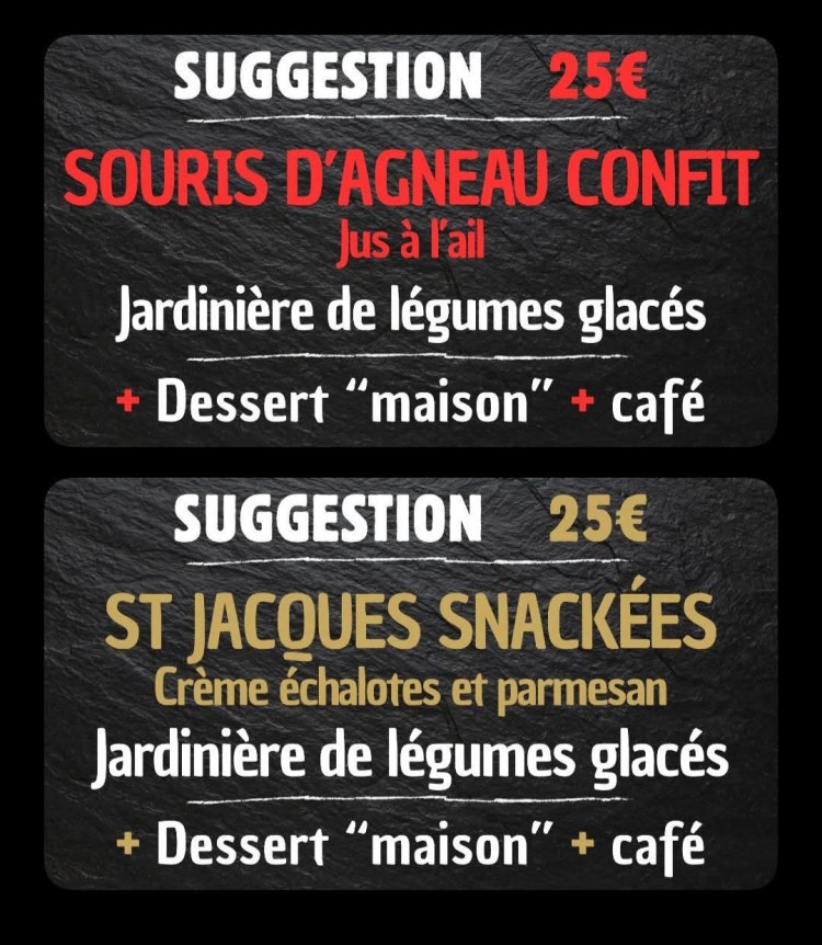 Notre chef élabore également une SUGGESTION éphémère à partir de produits de sélection (Souris d’agneau, pavé de thon, …)